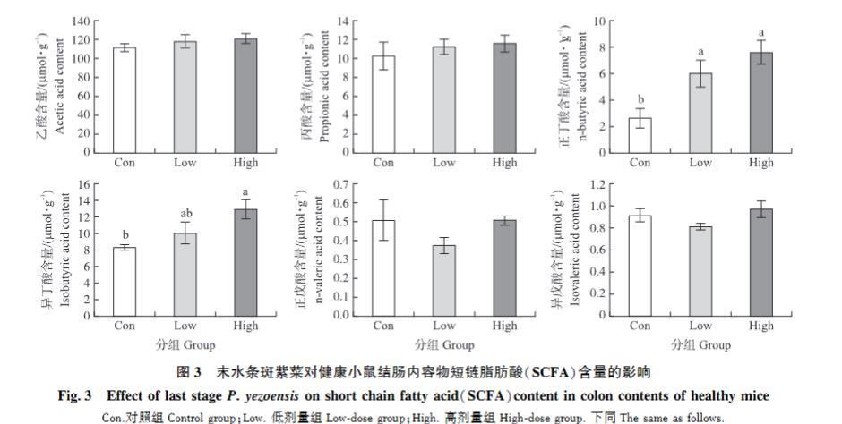 如图3所示:与未摄入末水条斑紫菜的小鼠相比,摄入低剂量和高剂量的末水条斑紫菜小鼠结肠内容物中乙酸、丙酸、正戊酸、异戊酸的含量没有显著性差异。但是,摄入高剂量的末水条斑紫菜的小鼠结肠内容物中正丁酸和异丁酸含量显著高于对照组。并且,低剂量组末水条斑紫菜也能够显著增加结肠内容物中异丁酸含量。
