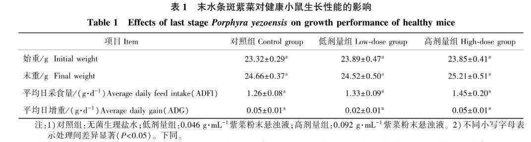 表1末水条斑紫菜对健康小鼠生长性能的影响
