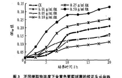 由于虎耳草提取物本身会对OD值产生影响,而每支试管中加入提取物的量不相同,所以图1和图2中各条曲线的起点不同。这样的曲线虽然可以清晰地显示培养液OD值的变化情况,但是难以比较不同提取物浓度组的生长差异。为了消除提取物本身对OD值的影响,在数据处理时,以加入提取物但未接种的培养液作空白,调整OD420值,以消除提取物本身色泽对试验结果的影响。