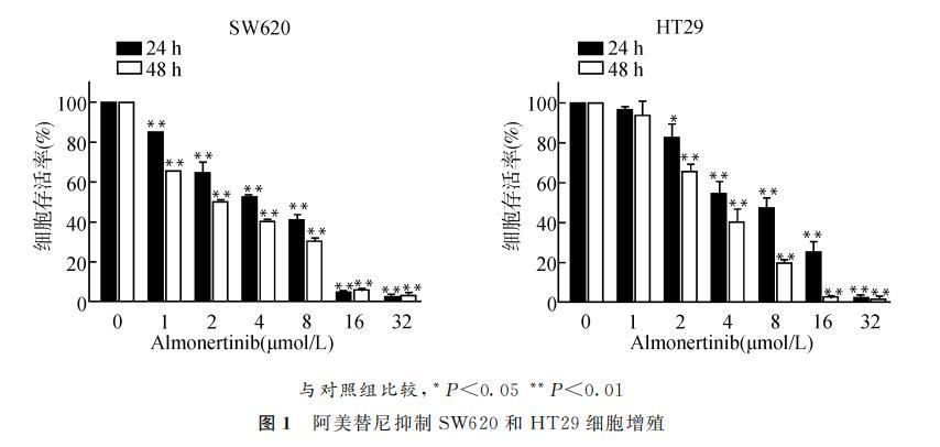 消化处理SW620、HT29细胞,牛鲍计数板计数,使细胞悬液浓度为5×10⁴个/mL,充分混悬后接种于96孔板中,每孔加100μL细胞悬液,放于37℃、5% CO₂培养箱中培养。待细胞密度达到60%~80%时,吸除培养液,加入含有不同浓度阿美替尼(0、1、2、4、8、16、32μmol/L)的培养液,每组设置6个复孔,分别孵育24、48h后,每孔加入10μL的CCK-8溶液(避光),37℃培养箱中孵育40 min,用酶标仪在450nm处测定吸光度(A)值,细胞存活率=(对照组A值-实验组A值)/对照组A值×100%。