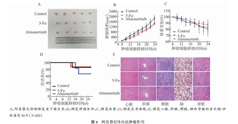 为了评价阿美替尼对结肠癌细胞体内生长的作用,本研究将SW620细胞移植到BALB/c裸鼠右前肢皮下制备裸鼠荷瘤模型。与对照组相比,阿美替尼抑制肿瘤生长,减缓裸鼠体重的降低,延长荷瘤裸鼠生存时间。