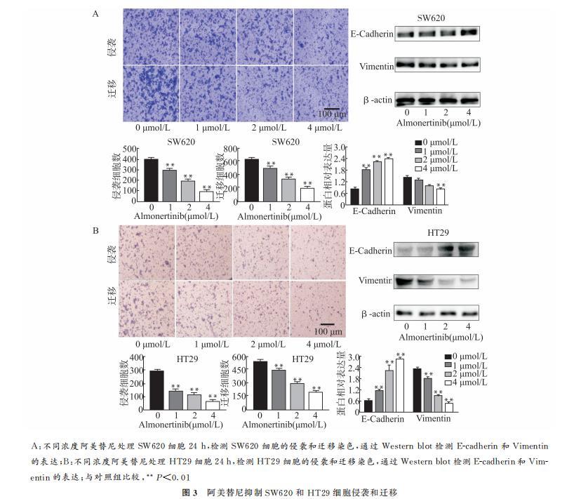 采用Western blot实验对侵袭迁移相关蛋白E-Cadherin、Vimentin进行检测,与对照组相比,不同浓度阿美替尼(1、2、4μmol/L)处理组SW620和HT29细胞中E-Cadherin蛋白表达显著升高、Vimentin蛋白表达显著降低。