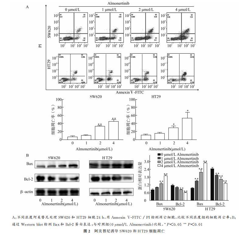 采用Western blot实验对凋亡相关蛋白Bax、Bcl-2进行检测,与对照组相比,不同浓度阿美替尼(1、2、4μmol/L)处理组SW620和HT29细胞中Bax蛋白表达显著升高、Bcl-2蛋白表达显著降低。