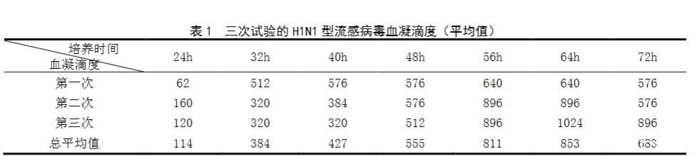 将H1N1型流感病毒(IVR-238)接种至9-11日龄鸡胚绒毛尿囊腔内,于温度33.0~35.0℃、湿度45%~65%的环境下进行病毒培养,分别在不同培养时间(24 h、32 h、48 h、56 h、64 h、72 h)收取鸡胚的尿囊液,进行血凝滴度检测以确定病毒增殖情况,并依据血凝滴度检测的结果及培养时间绘制出病毒的生长曲线。