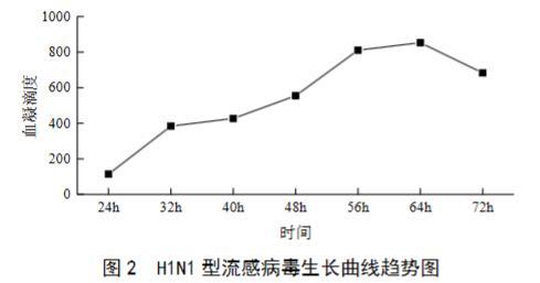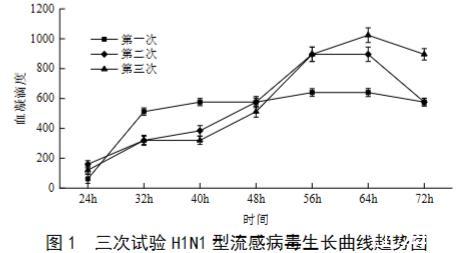 (3)将三次试验平均后的数据进行汇总求总平均值,得出H1N1型流感病毒生长曲线。由试验数据得出,H1N1型流感病毒(IVR-238)生长曲线在24~56 h呈上升趋势,在56~64 h趋于稳定,处于平稳期,在64~72 h呈下降趋势。H1N1型流感病毒(IVR-238)最佳病毒培养时间为56~64 h。