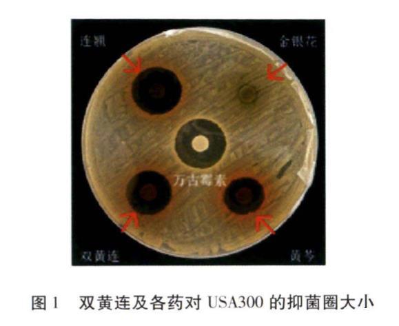 随后分别对连翘、金银花、黄芩三味药进行了MIC测定,结果可知连翘、金银花、黄芩的MIC分别为16、128、8 mg/mL。连翘对USA300具有较强的抑菌活性,抑菌活性依次为:连翘>双黄连>黄芩>金银花。见图1。