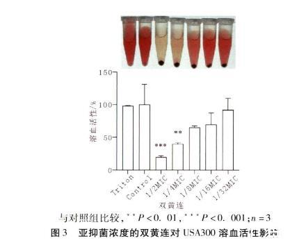 3.3 双黄连对USA300溶血活性及Hla蛋白的影响