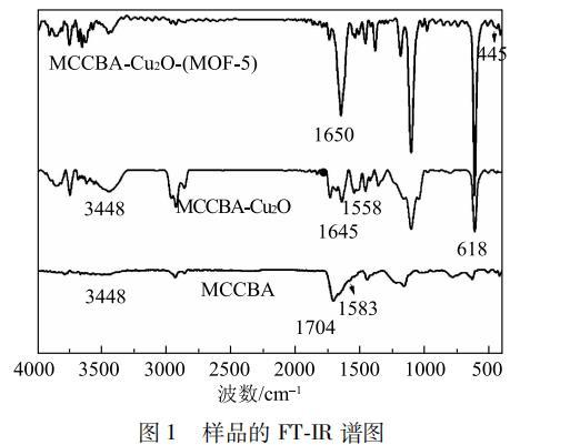 图1为样品的FT-IR谱图。从图1中可以看出,2920 cm-1, 1452 cm-1 和 1160 cm-1 处为纤维素的特征吸收峰。与纯MCC相比,形成MCCBA后,在1650cm-1和1580cm-1附近出现了新的吸收峰,分别归属于-COOH的非对称伸缩振动峰和CO-NH的振动峰,而在3448cm-1处的吸收峰是N-H的特征吸收峰,并且在形成NH后覆盖了MCC的-OH峰。对于MCCBA-Cu2O,在618cm-1处有强吸收峰,归属于Cu2O的吸收峰,这说明形成了Cu2O,在形成复合材料后,由于-COOH对Cu2O有强的吸引力,MCCBA的COOH振动峰从1704 cm-1 处迁移至1645 cm-1 处 。 MCCBA-Cu2O-( MOF-5)在 1650 cm-1附近处为BDC的对称和非对称振动峰,而在445 cm-1 处为ZnO的特征振动峰,表明形成了MOF-5 。上述结果说明,实验成功制备了 MCCBA-Cu2O-(MOF-5)三元复合材料。