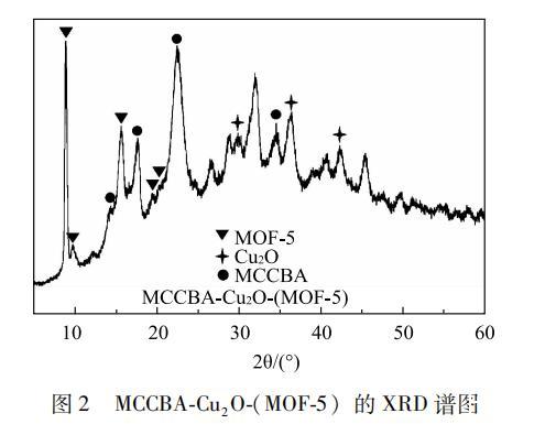 图2为制备的 MCCBA-Cu2O-(MOF-5)复合材料的XRD谱图。从图2可以看出,图中2θ=14.9°、16.4°、22.7°和34.5°分别归属于纤维素的101,10-、002和040晶面。除此之外,2θ=29.6°、36.4°和42.3°分别归属于Cu2O的110、111和200晶面,Jia等人证实了相似的结果。其次,2θ= 8.8°、9.6°、15.6°、19.2°和20.7°的衍射峰分别归属于MOF-5的200、220、400、420和531晶面,与He研究的结果相一致。XRD的结果表明成功制备出了MCCBA-Cu2O-(MOF-5)复合材料,这也佐证了FT-IR光谱的结果。