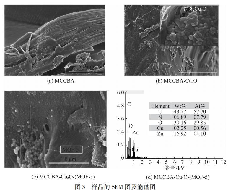 图 3为样品的 SEM图及能谱图。从图 3(a)可以看出,制备的MCCBA表面光滑,表现出成簇纤维状 。采用原位生长法引入Cu2O 后,制备的Cu2O为纳米级(50~100 nm)立方晶体,且分布在 MCCBA的表面(图3(b)),表明MCCBA和Cu2O成功复合。其次,从图3(c)和图3(d)能谱分布可以看出,三元复合材料成功引入了 MOF-5单晶,当再次采用原位生长法引入MOF-5后,①直接生成了部分 MOF-5并沉积在 MCCBA上;②以 MCCBA为骨架,沉积在MCCBA上的Cu2O为核,引入的MOF-5包覆了Cu2O,形成了具有核-壳-壳结构的MCCBA-Cu2O-(MOF-5)。吴鹏采用落球法将海藻酸钠和纤维素水凝胶球复合,发现海藻酸钠-纤维素水凝胶球复合材料具有相似的结构,即以纤维素水凝胶为骨架,海藻酸钠则在骨架上沉积聚集,从而形成微球材料。