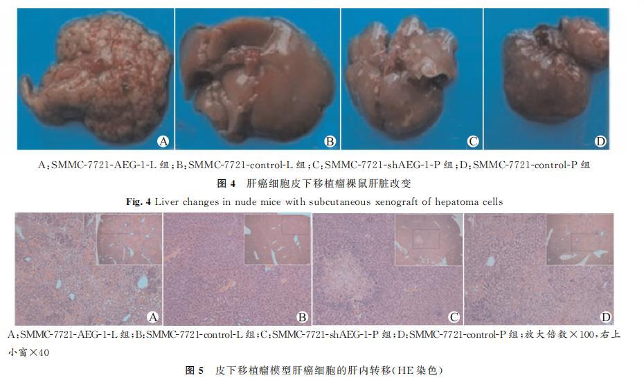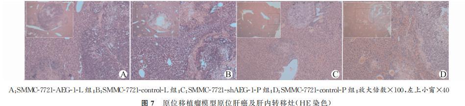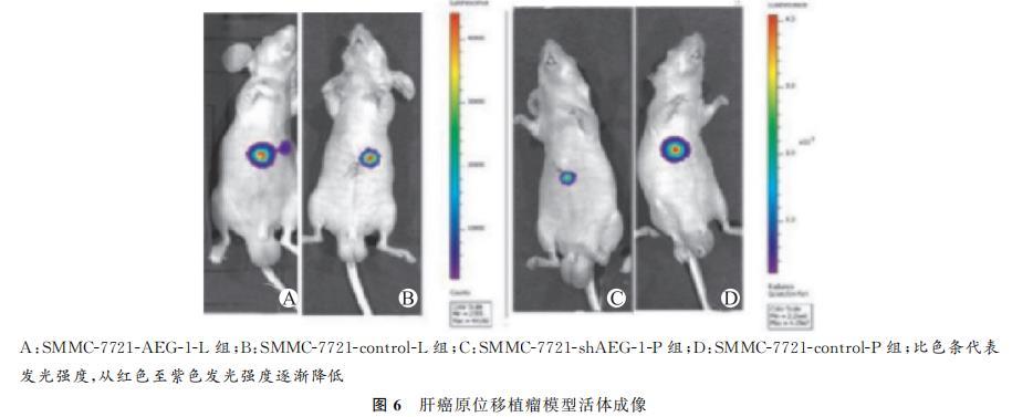 积和强度均显著增加;SMMC-7721-shAEG-1-P组肿瘤发光面积较小且发光强度明显降低,色阶比对小于SMMC-7721-control-P组的10%~20%(图6)。术后35天处死肝内原位移植瘤模型裸鼠,各组随机选择一只裸鼠取肝脏,进行石蜡包埋,光学显微镜组织学检测肝内包埋瘤体长径和转移灶数量:SMMC-7721-AEG-1-L组447.58μm,转移灶数量为11个,SMMC-7721-control-L组451.58μm,肝内转移灶数量为9个;SMMC-7721-shAEG-1-P组69.98μm,转移灶为6个;SMMC-7721-control-P组391.41μm,转移灶为9个。组间比较显示,SMMC-7721-AEG-1-L组和 SMMC-7721-control-L组存在显著差异;SMMC-7721-shAEG-1-P组的肿瘤大小及转移灶数量明显低于SMMC-7721-control-P组,见图7。