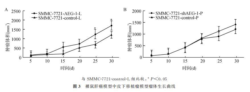 裸鼠皮下移植瘤模型,皮下接种SMMC-7721-AEG-1-L和 SMMC-7721-control-L细胞2d内接种部位皮丘完全消失,3~5d接种部位见突出于皮肤表面的实性瘤结节,成瘤率为100%(图2A、2B)。肿瘤体积测量显示,SMMC-7721-AEG-1-L组肿瘤体积大且生长迅速,在第10天出现生长高峰,SMMC-7721-control-L瘤体小且生长速度缓慢,组中有1肿瘤体积明显较小,注射肝癌细胞10d后瘤块消失,至第20天再次出现。造成这一现象的原因可能与肝癌细胞皮下注射部位缺少血供,以及裸鼠本身免疫功能未完全敲除有关。SMMC-7721-shAEG-1-P和 SMMC-7721-control-P细胞2d内接种部位皮丘完全消失,第5天接种部位见突出于皮肤表面的实性瘤结节,成瘤率为100%(图2C、2D)。在第25天和第30天的测量中,SMMC-7721-AEG-1-L组肿瘤体积均显著高于SMMC-7721-control-L组(均P<0.05,图3A)。而SMMC-7721-shAEG-1-P组、SMMC-7721-control-P组裸鼠肿瘤体积在6次测量中均无显著差异(均P>0.05,图3B)。30d后部分体积较大的肿瘤侵袭皮肤出现破溃。