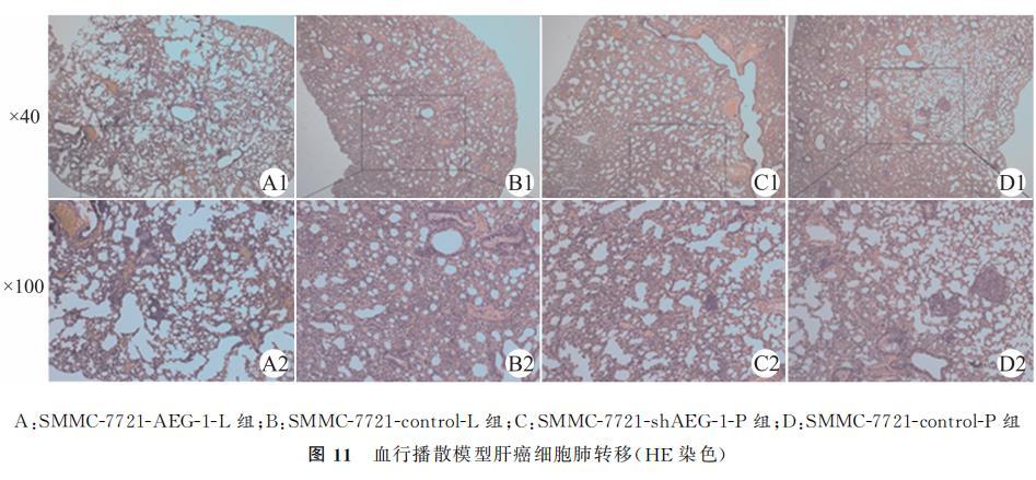 裸鼠肝癌细胞血行播散模型,以每只 5\times 10^6 的细胞数尾静脉注射SMMC-7721-AEG-1-L、SMMC-7721-control-L、SMMC-7721-shAEG-1-P和 SMMC-7721-control-P肝癌细胞。尾静脉注射35d后活体成像未观测到肺部发光转移灶,第60天后再次行活体成像发现肺转移率分别是:SMMC-7721-AEG-1-L组60%、SMMC-7721-control-L组20%;SMMC-7721-shAEG-1-P组 20%、SMMC-7721-control-P组60%。图10显示各组典型肺部转移结果,SMMC-7721-AEG-1-L组的肺右上叶和左侧三叶出现大片发光癌灶,SMMC-7721-control-L组大约在右肺门的位置检测到1处发光癌灶;SMMC-7721-shAEG-1-P组在左肺下叶有1处发光癌灶,SMMC-7721-control-P组全肺出现弥散性癌灶。裸鼠于尾静脉注射后的60d给予处死,取肺组织。肉眼可见SMMC-7721-control-P组裸鼠肺表面有满肺转移微小点状癌灶,其余3组肺表面未见异常。取部分肺组织石蜡包埋HE染色,光学显微镜下进行观测:SMMC-7721-AEG-1-L组转移灶有18个,SMMC-7721-control-L组有3个转移灶;SMMC-7721-shAEG-1-P组转移灶为5个,SMMC-7721-control-P组转移灶有23个(图11)。