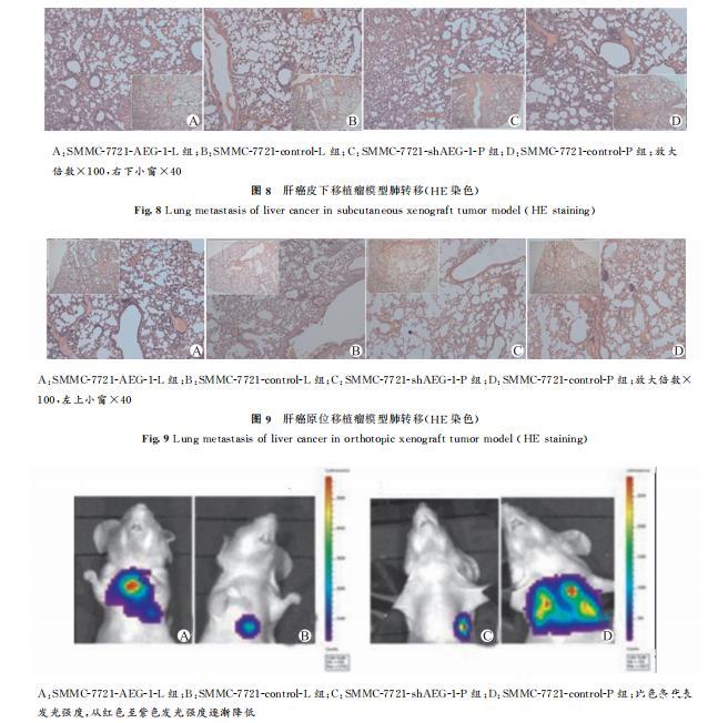 肝内原位移植瘤模型模拟人原发肝细胞癌,使用较为直观的动物活体成像的方法来检测原发肝癌中AEG-1基因表达在肿瘤肝内转移中所起的作用。原位移植瘤模型中,SMMC-7721-AEG-1-L组肝内有明显发光转移灶,SMMC-7721-shAEG-1-P组的肝脏肿瘤发光范围较小且没有发光转移灶。