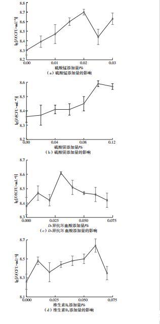 结果表明:在基础培养基中添加0.020%的硫酸锰时,LR-ZB1107-01的活菌数最多,达(5.07±0.37)×108 CFU/mL(如图4(a)所示);添加0.10%的硫酸镁时,活菌数达(3.87±0.19)×108 CFU/mL(如图4(b)所示);添加0.03%的D-异抗坏血酸时,活菌数最多,达(4.10±0.14)×108 CFU/mL(如图4(c)所示);添加0.06%的维生素B1时,活菌数达(4.43±0.65)×108 CFU/mL(如图4(d)所示);添加0.03%的维生素C时,活菌数达(3.80±0.29)×108 CFU/mL(如图4(e)所示);添加0.04%的叶酸时,活菌数达(2.04±0.16)×108 CFU/mL(如图4(f)所示)。