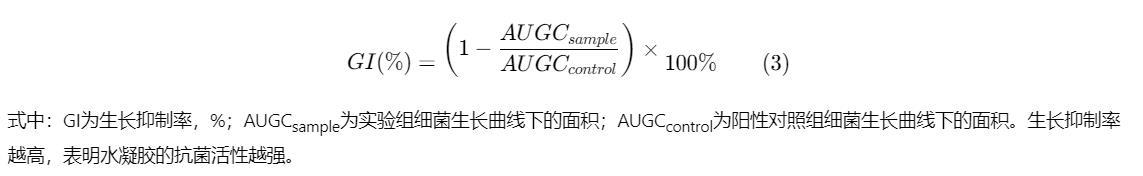 式中:GI为生长抑制率,%;AUGCsample为实验组细菌生长曲线下的面积;AUGCcontrol为阳性对照组细菌生长曲线下的面积。生长抑制率越高,表明水凝胶的抗菌活性越强。